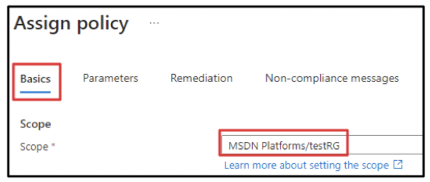 • Assign Policy 클릭- Scope에서 Subscription 및 Resource Group 선택- Parameters 탭- East US 선택